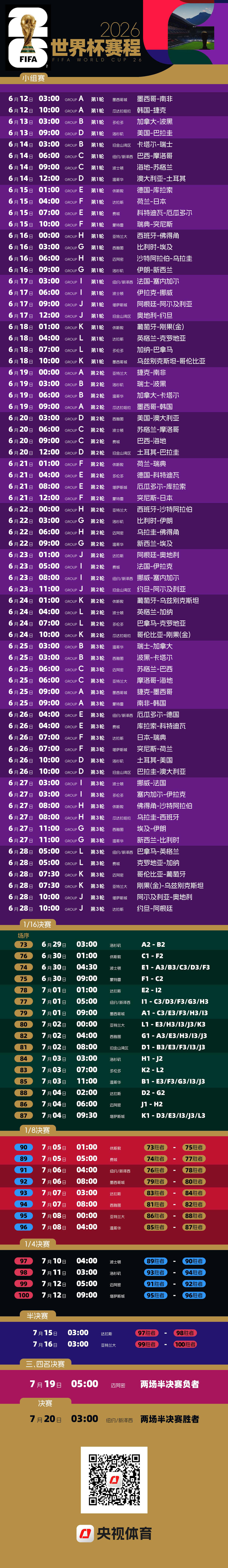 美加墨世界杯赛程出炉,揭幕战将于6月12日3点举行。详细赛程如下↓